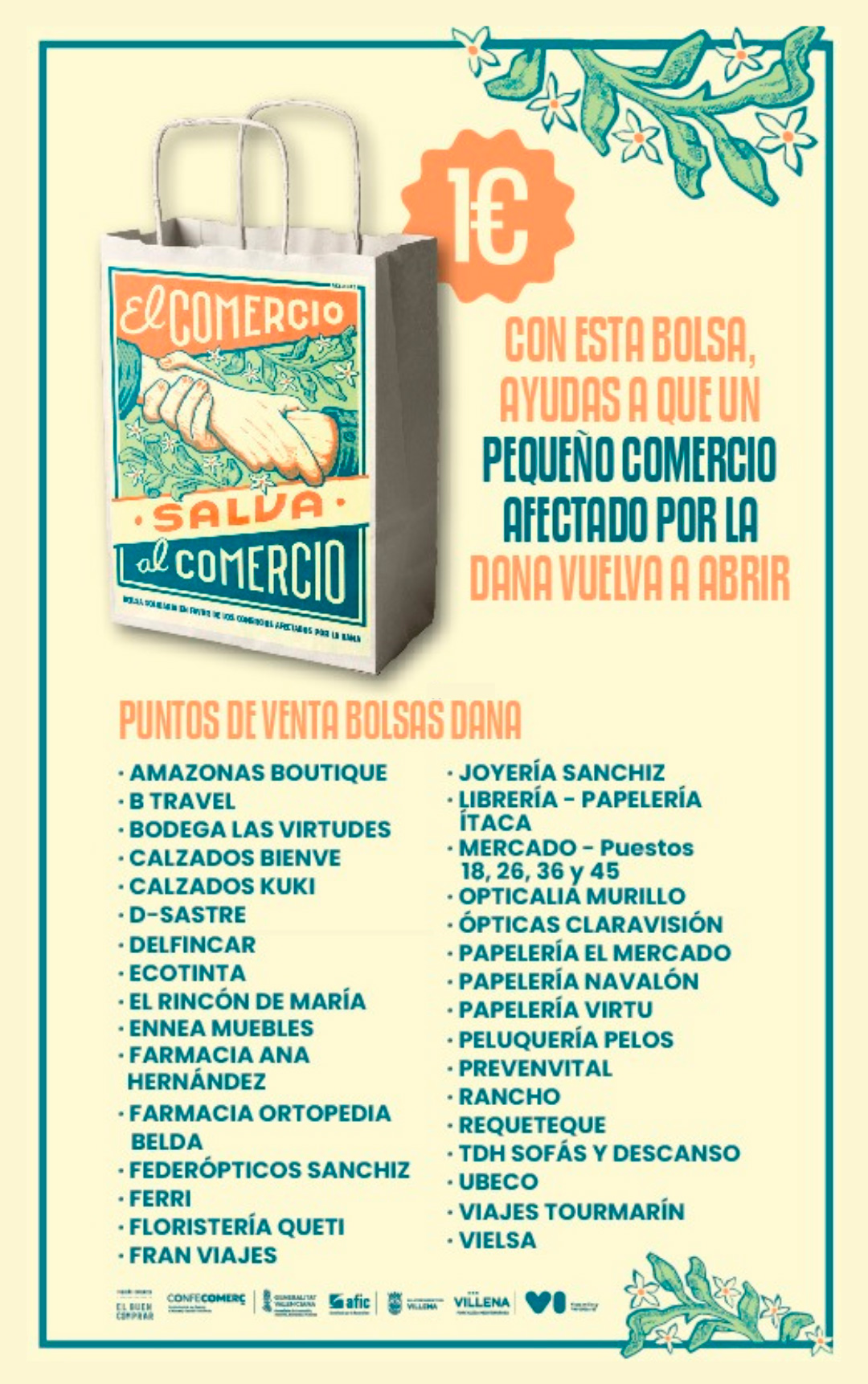 - 04/02/2025. Villena se ha unido a la iniciativa solidaria impulsada por la Confederación de Comercio de Alicante, Castelló i València Confecomerç, “El comercio salva al comercio”, destinada a recaudar fondos para ayudar a los comercios de proximidad afectados por la DANA. A partir del próximo 4 de febrero, 32 establecimientos de Comercios y Servicios Vi ofrecerán bolsas de papel ecológicas AQUARESIST, 110 gr resistentes al agua, biodegradables, 100% reciclables, apta para productos cárnicos, fruta y pescados a un euro. Los beneficios íntegros de esta acción se destinarán a cubrir reparaciones, reposición de mercancías y la reapertura de los negocios afectados.