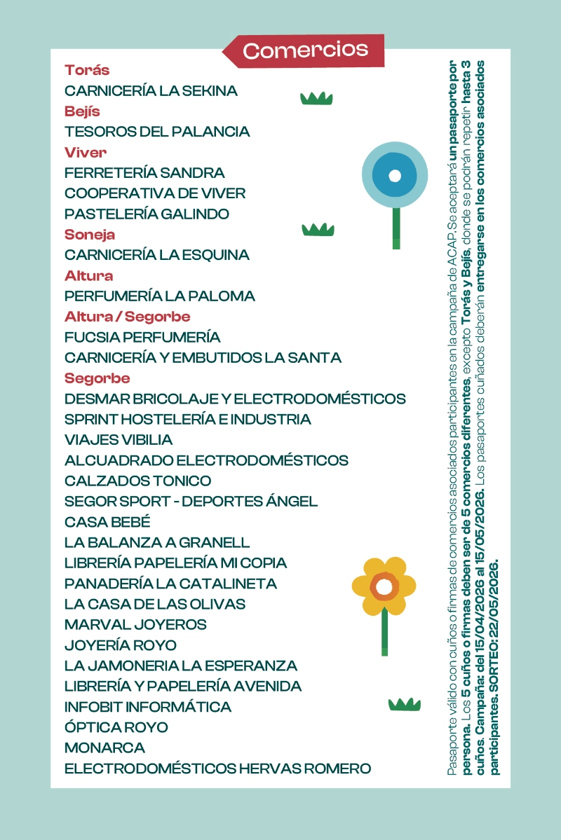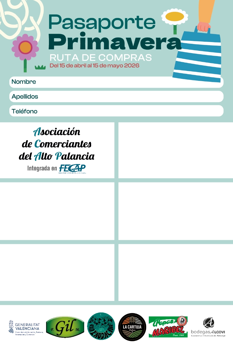La Asociación de Comerciantes del Alto Palancia (ACAP) ha puesto en marcha la campaña de dinamización comercial “Pasaporte Primavera – Ruta de Compras”, que se desarrollará del 15 de abril al 15 de mayo de 2026 y contará con la participación de 28 comercios de la comarca.