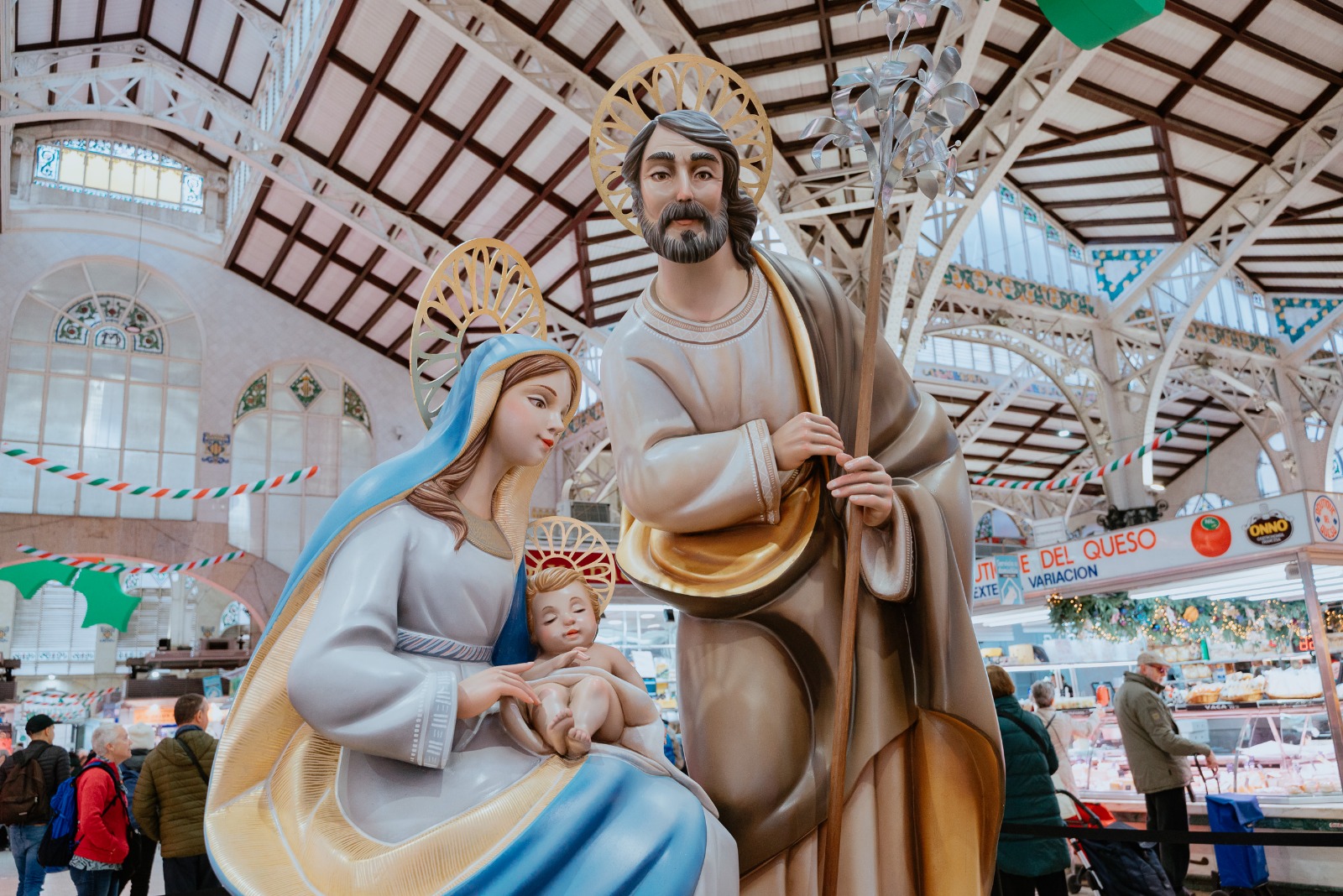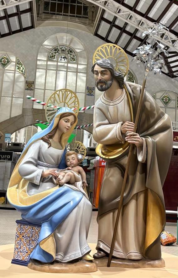 La Sagrada Família, que conforma el nuevo Nacimiento se ha modelado en barro y digitalmente ha sido escalado a una proporción monumental, presidirá en adelante la cúpula del Mercado Central cada diciembre hasta la llegada de los Reyes Magos. La policromía, que recuerda a la artesanía de porcelana por las tonalidades elegidas, incluye acabados en pan de oro que elevan el conjunto escultórico a obra de arte que se integra con la centenaria arquitectura modernista del mercado más visitado de Europa. La base sobre la que descansan las figuras recupera el detalle de los azulejos que decoran el exterior del Mercado Central y que forman parte de la iconografía de la ciudad de València.