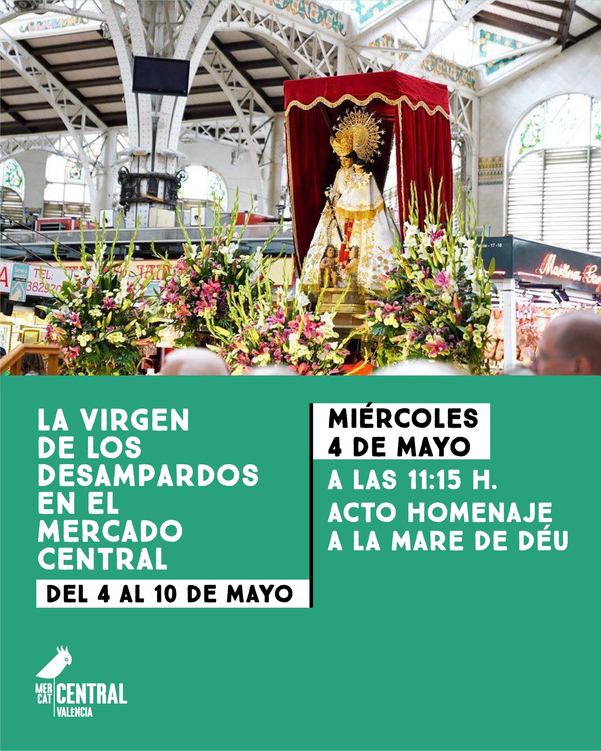 Los vendedores del Mercado Central de València celebrarán este miércoles, 4 de mayo, su tradicional ofrenda de flores a la Virgen de los Desamparados, que se venera en el propio recinto, dentro del programa de actos organizados por las Camareras de la Virgen del Mercat, con motivo de la festividad de la patrona de los valencianos.