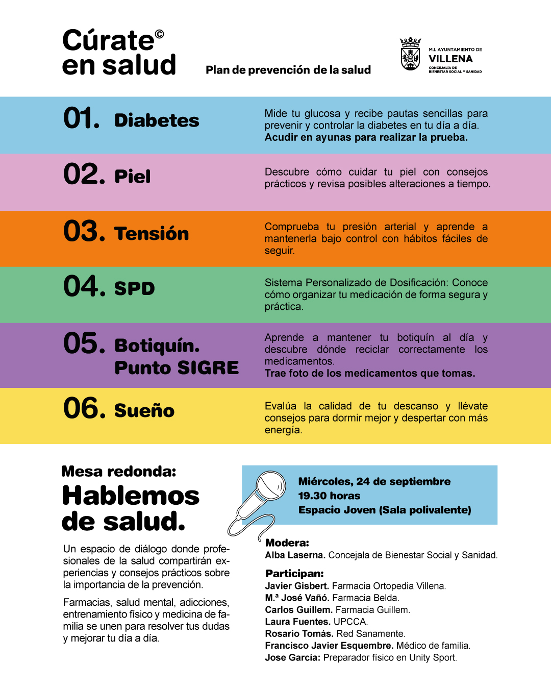 Com a activitat prèvia, el dimecres 24 de setembre a les 19.30 h en l’Espai Jove, se celebrarà la taula redona “Parlem de salut”, amb la participació de farmacèutics i professionals de la infermeria comunitària, salut mental, addiccions i medicina de família.